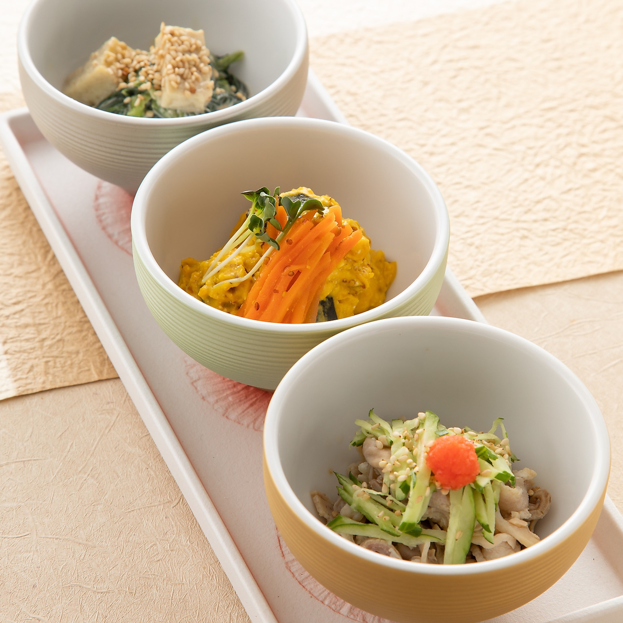 種類豊富なおばんざいは、好きなものを探して選ぶのが楽しいですが、探すのが面倒なときには料理長おまかせの盛り合わせが便利です。「本日のおばんざい3種盛り合わせ」1,155円(税込み)、「本日のおばんざい5種盛り合わせ」1,815円(税込み)の2種類の盛り合わせをご用意しています。その日の気候や仕入れに合わせたおすすめがピックアップされるので、何が登場するかな?と楽しみにしていてくださいね。