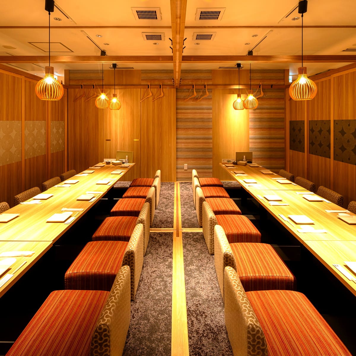 当店でしたら最大56名様までのご宴会も1つの個室でお楽しみいただけます。もちろん、壁と扉で仕切られた個室空間となります。例えば、会社の懇親会や接待、歓迎会、イベント、同窓会など大人数でのお集りも安心してお楽しみいただけます。